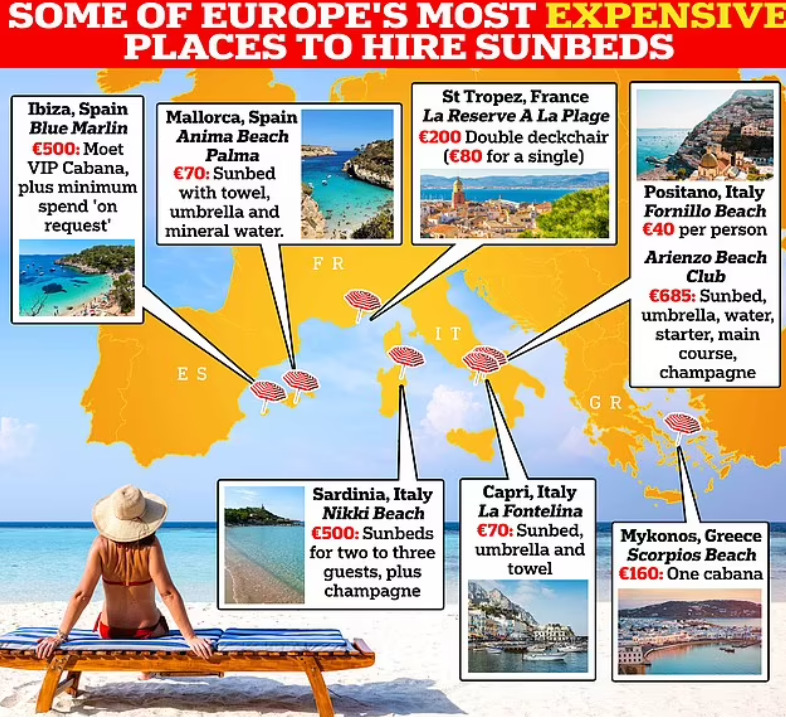 Είναι χαρακτηριστικό το δημοσίευμα της Daily Mail που απαριθμεί τα κόστη για τις ξαπλώστρες στα κορυφαία παραλιακά θέρετρα της Ευρώπης, με τις τιμές για τους τουρίστες να είναι για όλα τα βαλάντια.