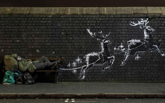 Στην τοιχογραφία, ο Banksy, με τη γνωστή άσπρη και μαύρη παλέτα του η οποία είναι και το σήμα κατατεθέν του, απεικονίζει τους δύο ταράνδους που σέρνουν ένα παγκάκι στο οποίο έχει ξαπλώσει ένας άστεγος, ο Ράιαν, δίπλα στις σακούλες με όλα τα υπάρχοντά του. Το σκηνικό παραπέμπει στο έλκηθρο του Άγιου Βασίλη με αναφορά στους ανθρώπους που δοκιμάζονται περισσότερο από όλους, ειδικά μέσα στην «καρδιά» του βρετανικού χειμώνα.