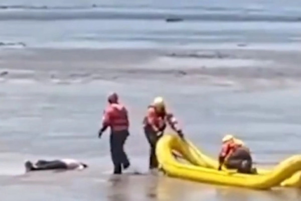 Οι διασώστες πλησίασαν με μια φουσκωτή βάρκα και όταν πήγαν από πάνω του, ο άντρας αυτός σηκώθηκε και τους είπε ότι είναι μια χαρά. Απλά καθόταν εκεί και… χαλάρωνε.