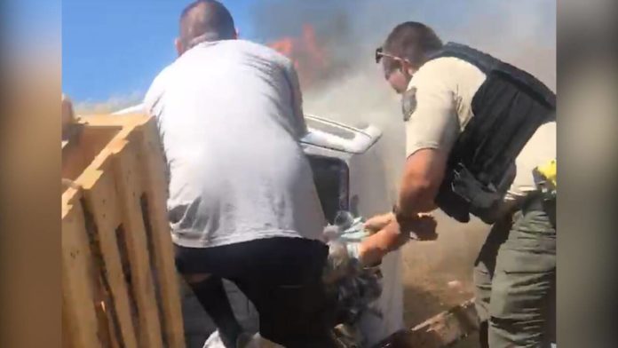 Οι δραματικές στιγμές της διάσωσης ενός άνδρα από την Καλιφόρνια ο οποίος εγκλωβίστηκε στο φλεγόμενο όχημά του, από έναν περαστικό και έναν βοηθό σερίφη κατέγραψε βίντεο.