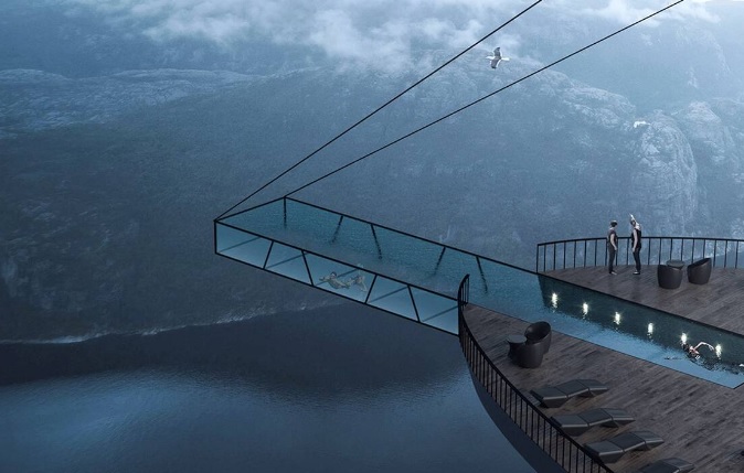 Για κάποιους εκπληκτικής ομορφιάς, για κάποιους άλλους τρομακτικό: Όπως και να’χει, η έμπνευση ενός ξενοδοχείου σε ύψος 600 μέτρων από την επιφάνεια της θάλασσας και στην κορυφή του Preikestolen, ενός θεόρατου, απόκρημνου βράχου σε φιορδ της Νορβηγίας, κόβει την ανάσα.