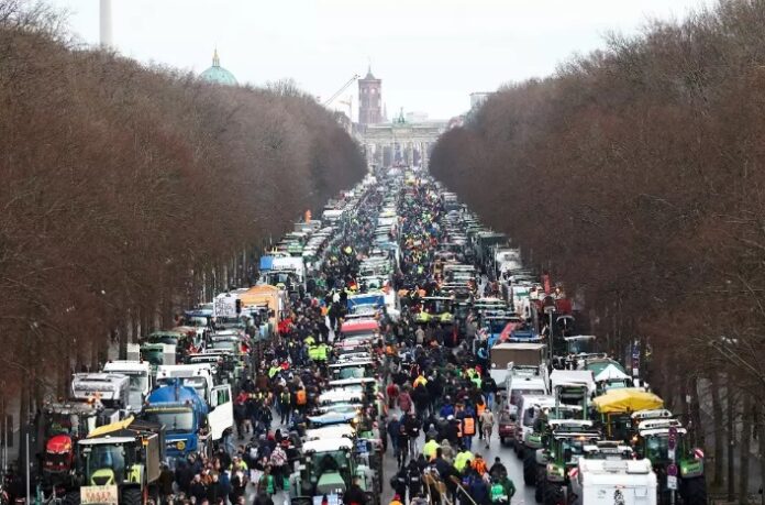 Σε αυτό, σύμφωνα με τους ίδιος υπολογισμούς, συμμετέχουν περισσότεροι από 10.000 άνθρωποι! Η Ένωση Αγροτών Γερμανίας βρίσκεται σε «εβδομάδα δράσης» από την προηγούμενη Δευτέρα, με συγκεντρώσεις και μπλόκα σε όλη τη χώρα, ενώ περίπου 700 τρακτέρ και αγροτικά φορτηγά είναι εδώ και μία εβδομάδα σταθμευμένα μπροστά στην Πύλη του Βραδεμβούργου.