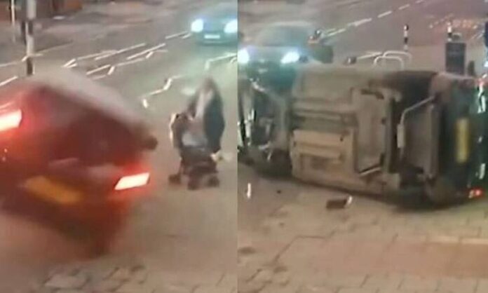 Τη στιγμή ενός τρομακτικού τροχαίου σε κεντρικό δρόμο της Αγγλίας έχει καταγράψει κάμερα ασφαλείας. Μια μητέρα βαδίζει στο πεζοδρόμιο έχοντας στο καρότσι τη 2χρονη κόρη της, όταν ξαφνικά εμφανίζεται ένα τζιπ να κινείται κατά πάνω τους.