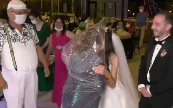 Το βίντεο δείχνει μία καλεσμένη σε γάμο που φοράει σακούλα προκειμένου να φιλήσει τους νεόνυμφους λόγω των μέτρων ασφαλείας για τον κορονοϊό.