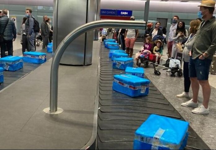 Τουλάχιστον 100 κιβώτια με ψάρια και θαλασσινά, όπως αναφέρει δημοσίευμα του BBC, γύριζαν στον ιμάντα μεταφοράς αποσκευών, με τους επιβάτες της British Airlines όχι μόνο να ψάχνουν απεγνωσμένα τις βαλίτσες τους αλλά να πρέπει να αντιμετωπίσουν και την έντονη δυσοσμία.