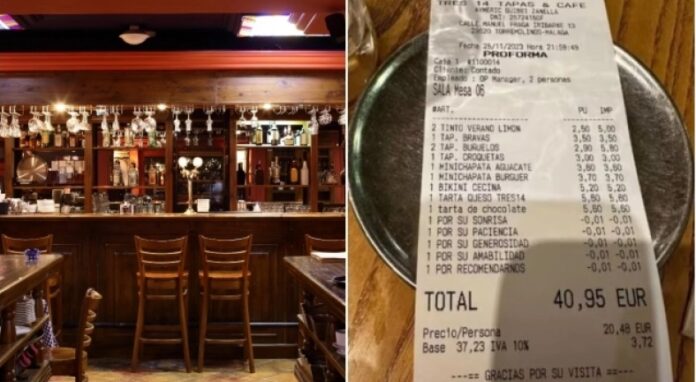 Κι αυτό γιατί κατάφερε να γίνει viral στα social media, εξαιτίας των πολύ περίεργων εκπτώσεων που κάνει στους πελάτες του. Πιο συγκεκριμένα, ένας χρήστης ανέβασε πρόσφατα στο Twitter (X) την απόδειξη που του έφερε το Tres 14 Tapas & Café, το οποίο βρίσκεται στη Μάλαγα, βλέποντας προς έκπληξή του μερικές ιδιαίτερες εκπτώσεις.