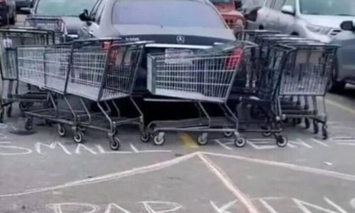 «Aυτό είναι συμβαίνει όταν παρκάρετε σαν μα…κας» έγραψε ο John που έφερε στη δημοσιότητα το βίντεο, συμπληρώνοντας μάλιστα, πως όποιος έβγαινε από το σούπερ μάρκετ, άφηνε εκεί το καρότσι του μαζί με τα άλλα.