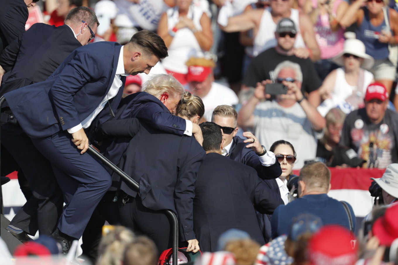 Ο Τραμπ εμφανίστηκε όρθιος ξανά περίπου ένα λεπτό αργότερα, με το καπελάκι του με το σύνθημα «Make America Great Again» να έχει πέσει, ενώ ακούστηκε να λέει προς τους πράκτορες «περιμένετε, περιμένετε», προτού υψώσει τη γροθιά του καθώς τον οδηγούσαν σε ένα μαύρο SUV.