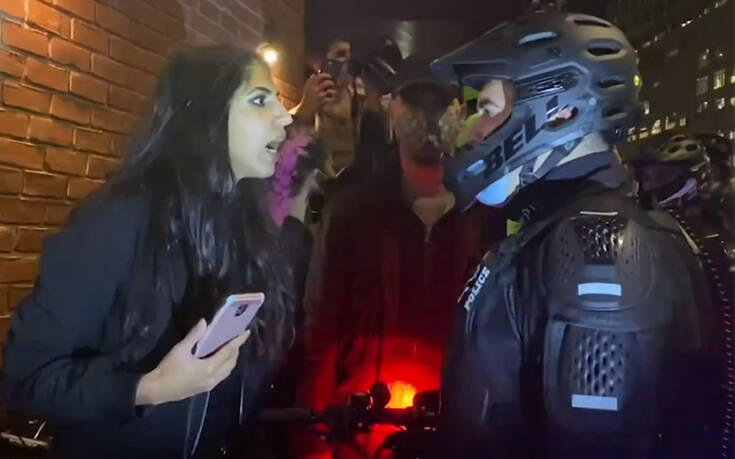 Πρόσωπο με πρόσωπο ήρθαν μια διαδηλώτρια και ένας αστυνομικός κατά τις πρόσφατες και βίαιες ταραχές στη Νέα Υόρκη.