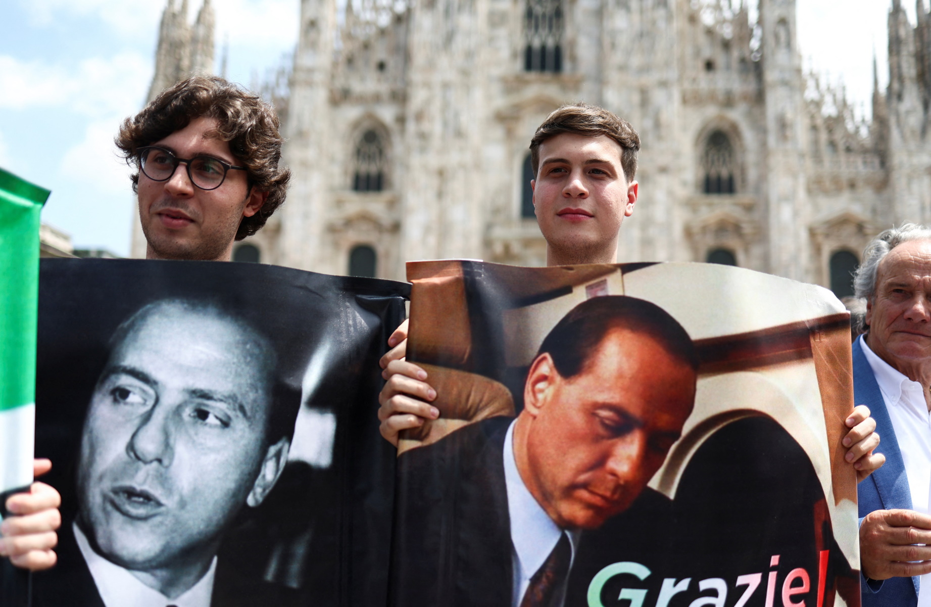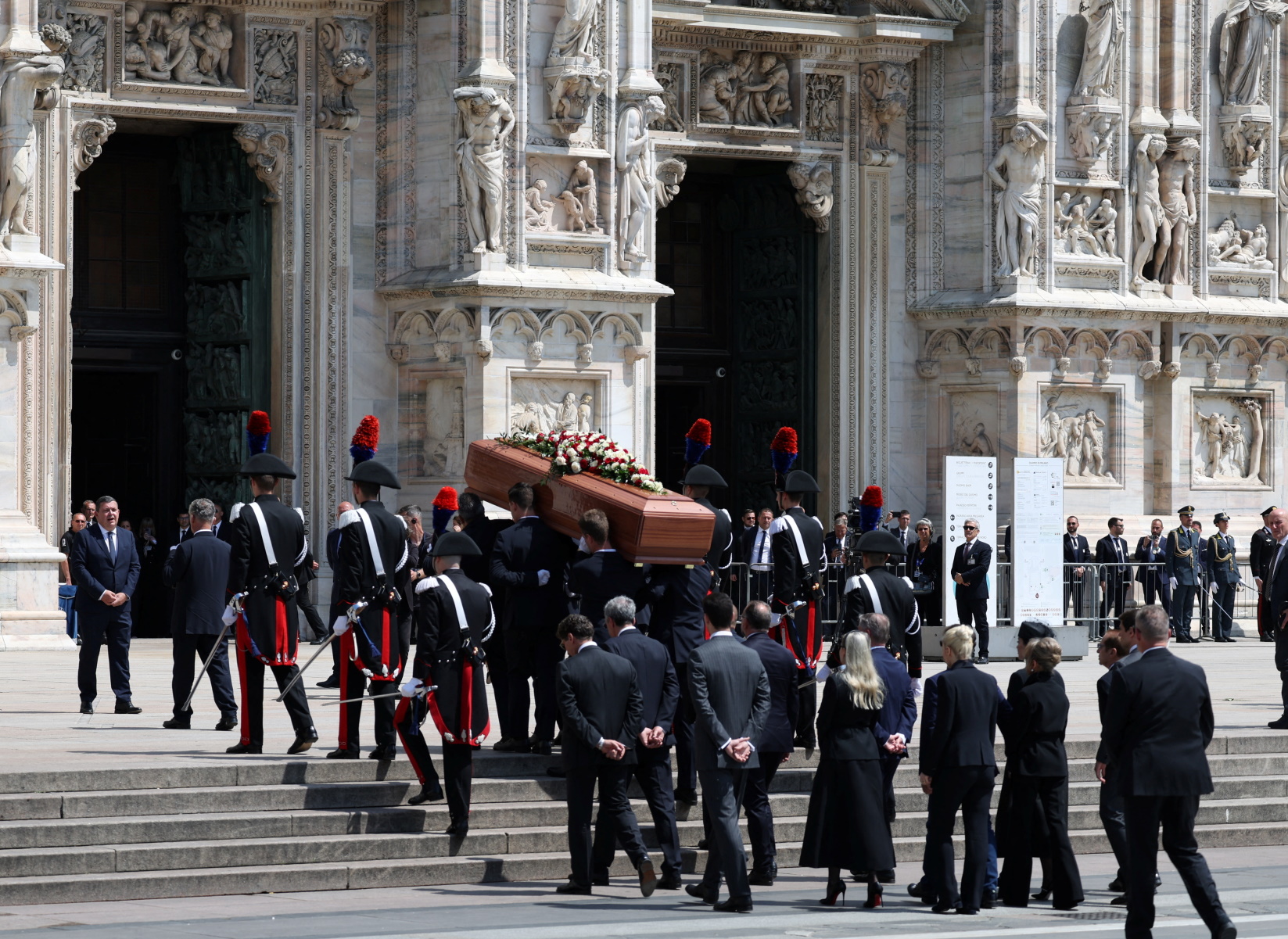 Κατάμεστη η περιοχή του καθεδρικού ναού Ντουόμο του Μιλάνου, όπου στις 4 το απόγευμα ώρα Ελλάδας ξεκίνησε η εξόδιος ακολουθία του Σίλβιο Μπερλουσκόνι. Στην πρώτη σειρά καθισμάτων, στο εσωτερικό του ναού, κάθονται η μεγαλύτερη κόρη του Καβαλιέρε, η Μαρίνα, η τελευταία του σύντροφος, Μάρτα Φασίνα και, σε λίγα μέτρα απόσταση, η πρώην σύζυγος, η Βερόνικα Λάριο.
