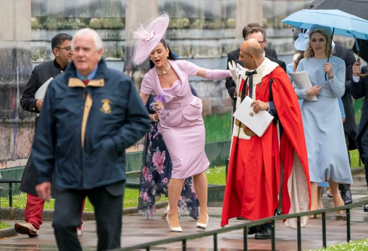 Μετά το πέρας της τελετής στέψης, η Κέιτι Πέρι παραπάτησε την ώρα που αποχωρούσε από το Αββαείο του Γουέστμινστερ και η στιγμή απαθανατίστηκε από τον φακό του Reuters: