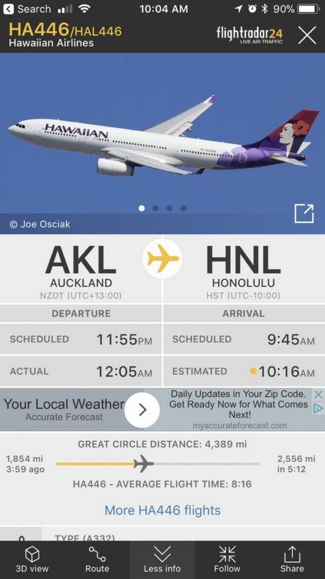 Η πτήση HAL446 της Hawaiian Airlines έπρεπε να αναχωρήσει από το Auckland της Νέας Ζηλανδίας, στις 11.55 μ.μ. τοπική ώρα το 2017.