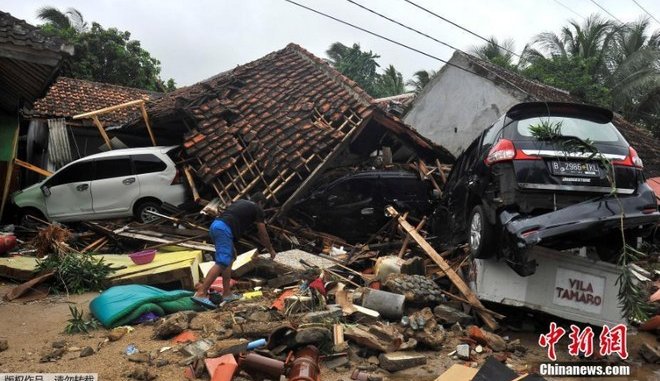 Εκατοντάδες κτίρια ισοπεδώθηκαν από τα κύματα, τα οποία έπληξαν τις νότιες ακτές της Σουμάτρας και το δυτικό άκρο της Ιάβας γύρω στις 21.30 τοπική ώρα, το Σάββατο το βράδυ. Το τσουνάμι προκλήθηκε μετά την έκρηξη του ηφαιστείου Ανάκ Κρακατόα, ανέφερε ο Σουτόπο Πουρβό Νουγκρόχο, ο εκπρόσωπος τύπου της Εθνικής Αρχής Διαχείρισης Καταστροφών.