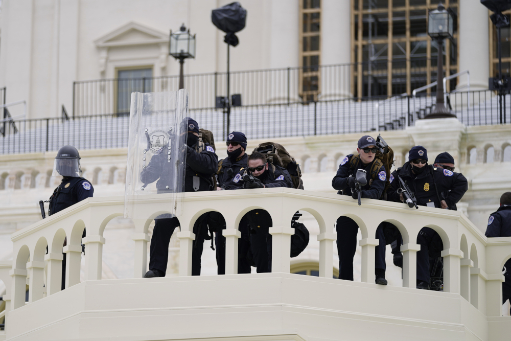 Όπως φαίνεται από φωτογραφίες και βίντεο, οι οπαδοί του Τραμπ εισέρχονται στο Καπιτώλιο σπάζοντας παράθυρα, ενώ έχουν κυκλοφορήσει και φωτογραφίες που δείχνουν άνδρες της ασφαλείας του κτιρίου να σημαδεύουν διαδηλωτές με όπλα.