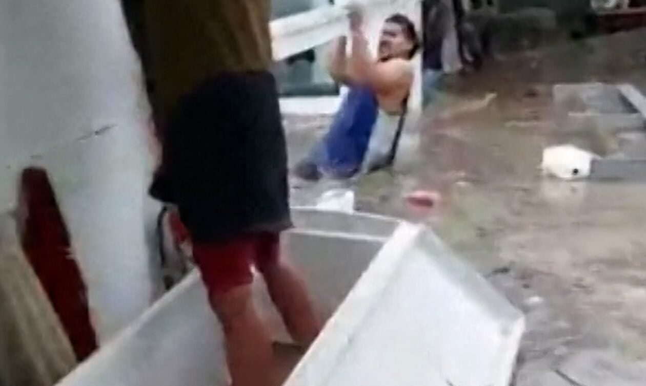 Βίντεο που αναρτήθηκε στα μέσα κοινωνικής δικτύωσης δείχνει άνδρες να γελάνε με τις ασυνήθιστες επιλογές μετακίνησης καθώς περιηγούνται στα γεμάτα συντρίμμια νερά. Βυθισμένα οχήματα βρίσκονται διάσπαρτα στο δρόμο, ενώ άλλοι καταφεύγουν στην κορυφή μιας στέγης.