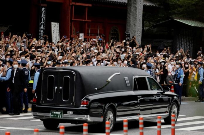 Με προσευχές, λουλούδια και σημαίες, πλήθος πολιτών είχε κατακλύσει τα πεζοδρόμια, ενώ είχε αναπτυχθεί ισχυρή αστυνομική παρουσία καθώς πλησίαζε η νεκροφόρα με τη σορό του Σίνζο Άμπε που είχε ξεκινήσει από έναν ναό του κεντρικού Τόκιο.