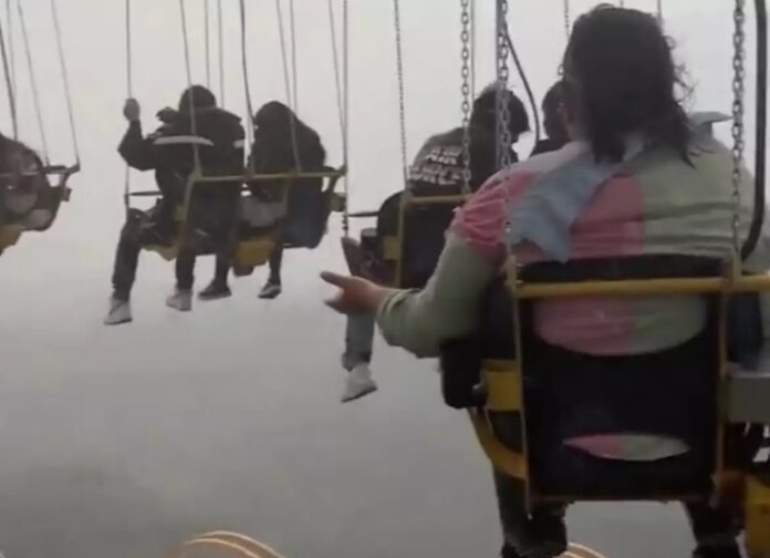 Στο βίντεο ντοκουμέντο που δημοσιεύτηκε, φαίνονται αρκετοί άνθρωποι να κρατιούνται σφιχτά από τις αλυσίδες του παιχνιδιού ενώ βρέχει έντονα και φυσάει.