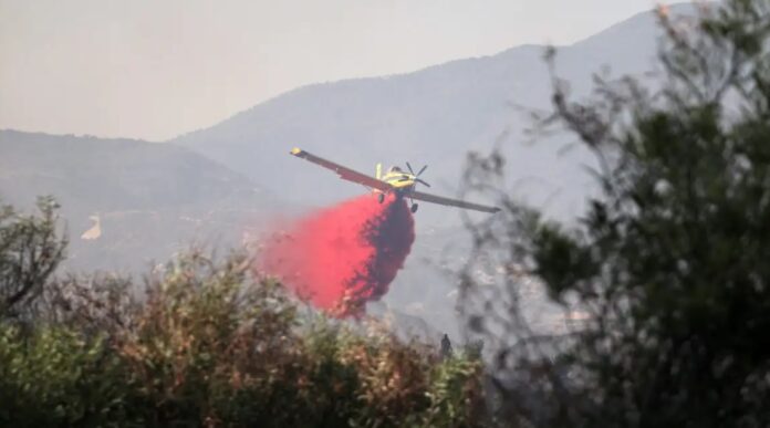 Από τις πρώτες πρωινές ώρες, πέντε εναέρια μέσα επιχείρησαν με ρίψεις, προσπαθώντας να περιορίσουν τα ενεργά μέτωπα.