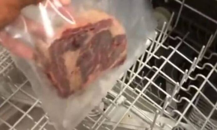 Ο δημοσιογράφος αφού έβαλε αλάτι και πιπέρι στην μπριζόλα, την σφράγισε σε μια πλαστική σακούλα και στη συνέχεια την έβαλε στο πλυντήριο πιάτων. Στο παρακάτω βίντεο που δημοσίευσε στον λογαριασμό του, δείχνει την διαδικασία, η οποία κράτησε για 96 λεπτά.