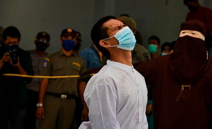 Δύο ομοφυλόφιλοι άντρες ικέτευαν για έλεος καθώς μαστιγώνονταν από 77 φορές ο καθένας στην Ινδονησία σήμερα επειδή κατηγορήθηκαν για παραβίαση του ισλαμικού νόμου.