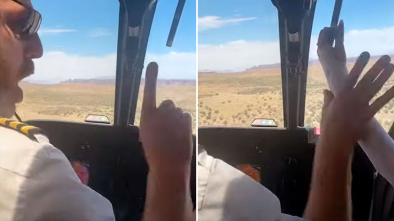 Στο βίντεο μέσα από το ελικόπτερο ακούγεται ο πιλότος να λέει «όχι, αυτό θα μας σκοτώσει» εμφανώς θυμωμένος με την τουρίστρια που προσπαθεί να πιάσει τον μοχλό.
