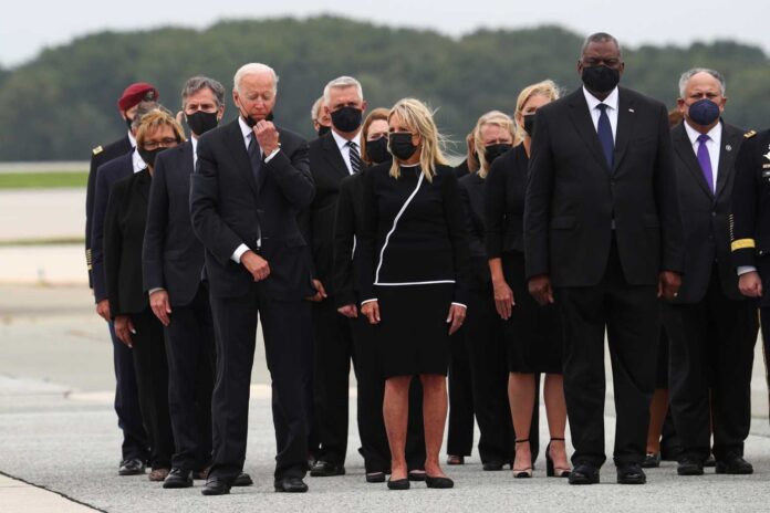 Ο Τζο Μπάιντεν βρέθηκε στην αεροπορική βάση του Ντόβερ, στο Ντέλαγουεαρ για να υποδεχτεί τις σορούς των 13 στρατιωτών που σκοτώθηκαν στην Καμπούλ. Μαζί του ήταν η σύζυγός του, Τζιλ, ο υπουργός Άμυνας Λόιντ Όστιν και πολλοί ανώτατοι στρατιωτικοί αξιωματούχοι.