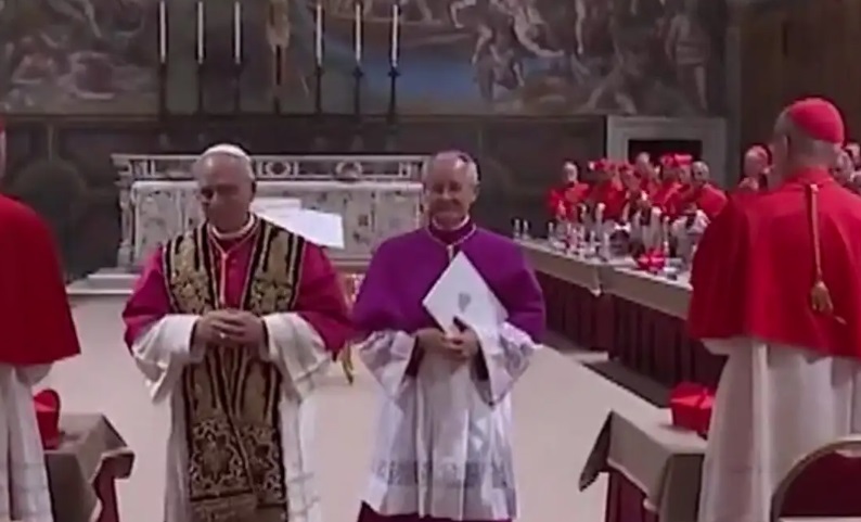 Σύμφωνα με τα πλάνα που έρχονται στο φως ο νέος ποντίφικας, ο Αμερικανός Καρδινάλιος Ρόμπερτ Πρέβοστ, φαίνεται μαζί με τους τους 133 Καρδινάλιους να ψέλνουν.