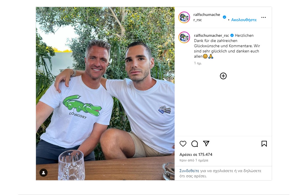 Υπενθυμίζεται ότι το βράδυ της Κυριακής (14.7.2024) ο Ραλφ Σουμάχερ έκανε μια ανάρτηση, όπου μαζί με τον σύντροφό του ατενίζουν τη θάλασσα, αποκαλύπτοντας για πρώτη φορά ότι είναι γκέι. Ο αδερφός του μεγάλου πρωταθλητή της Formula 1, Μάικλ Σουμάχερ στο παρελθόν είχε παντρευτεί, ενώ έχει αποκτήσει ένα γιο από τον γάμο του με την Κόρα Μπρίνκμαν.Έκτοτε έλαβε δεκάδες μηνύματα συμπαράστασης και συγχαρητήρια που κατάφερε να βρει το θάρρος και να αποκαλύψει λεπτομέρειες για την προσωπική ζωή του.