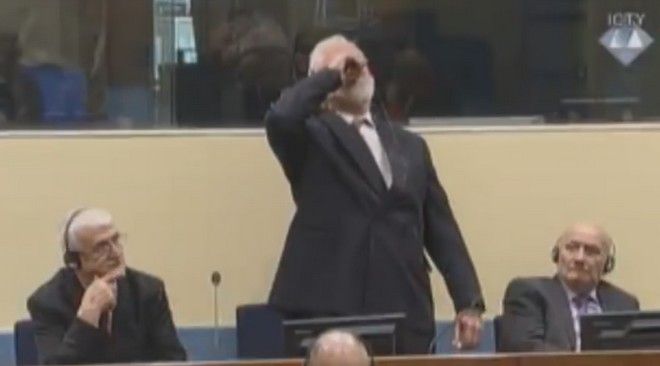 Το περιστατικό συνέβη κατά την εκφώνηση της ετυμηγορίας στο εφετείο του ΔΠΔ για την πρώην Γιουγκοσλαβία σε βάρος έξι πρώην υψηλόβαθμων πολιτικών και στρατιωτικών αξιωματούχων των Κροατών της Βοσνίας που κατηγορούνται για εγκλήματα πολέμου και εγκλήματα κατά της ανθρωπότητας που διαπράχθηκαν στη διάρκεια της κροατομουσουλμανικής σύγκρουσης (1993-1994) στο πλαίσιο του πολέμου στη Βοσνία-Ερζεγοβίνη (1992-1995).