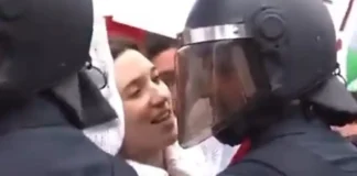 Το… φλερτ διαδηλώτριας με ΜΑΤατζή με το πλακάτ στο χέρι (βίντεο)