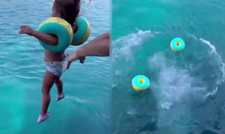 «Κόβει» την ανάσα το βίντεο που κυκλοφορεί στο ίντερνετ και δείχνει ένα μικρό κορίτσι να το «πετάνε» στη θάλασσα με μπρατσάκια, πάνω από ένα σκάφος, και να… εξαφανίζεται. Το παιδί πέφτει στη θάλασσα και στην επιφάνεια μένουν μόνο τα μπρατσάκια του…
