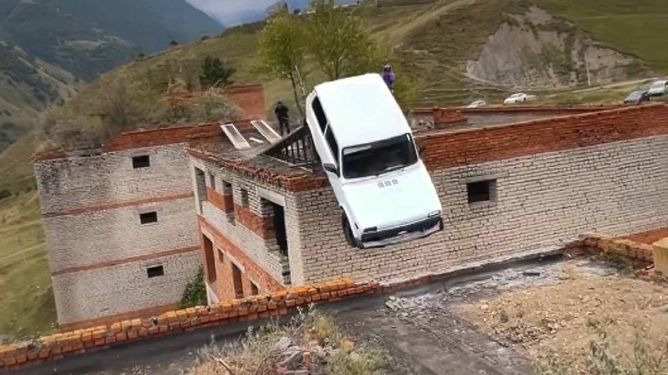Αφού πήρε θέση μέσα στο λευκό Lada Niva του, έβαλε μπρος και επιχείρησε να ανέβει με μεγάλη ταχύτητα μια ράμπα και να πηδήξει στο διπλανό, χαμηλότερο κτίριο. Ωστόσο ο παράτολμος άνδρας δεν κατάφερε να επιταχύνει όσο έπρεπε και το αυτοκίνητο συγκρούστηκε στον απέναντι τοίχο και έπεσε στο κενό.