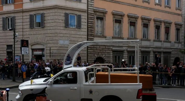 Το φέρετρο του Πάπα Φραγκίσκου βρίσκεται πάνω στο popemobile, όπως είναι το παρατσούκλι που έχει δοθεί στο όχημα υψηλής ασφαλείας στο οποίο ταξιδεύει ο Πάπας για να συναντήσει τους πιστούς κατά τις επίσημες επισκέψεις του.