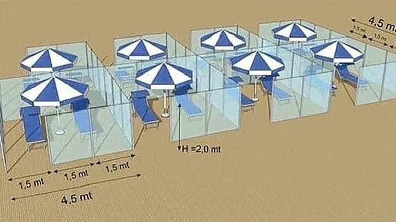 Συγκεκριμένα, η εταιρεία Μόντενα προτείνει ατελείωτες σειρές από ομπρέλες και ξαπλώστρες πάνω στην άμμο, αλλά μέσα σε… ασκεπή κουτιά από πλέξιγκλας. Μέσα σε αυτά τα κουτιά θα χωρά ένα ζευγάρι Ιταλών -το πολύ μια ολιγομελής οικογένεια- και έτσι όλοι θα είναι προστατευμένοι από τους ιούς και τα μικρόβια των διπλανών τους.