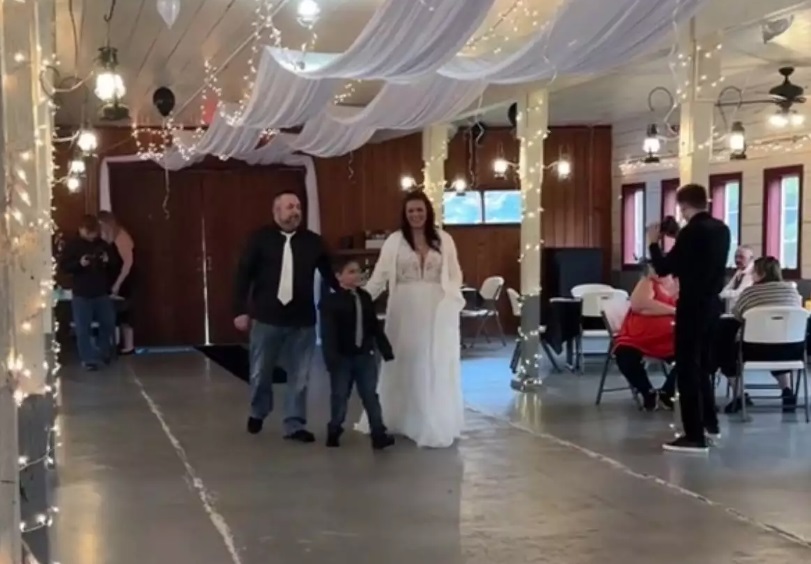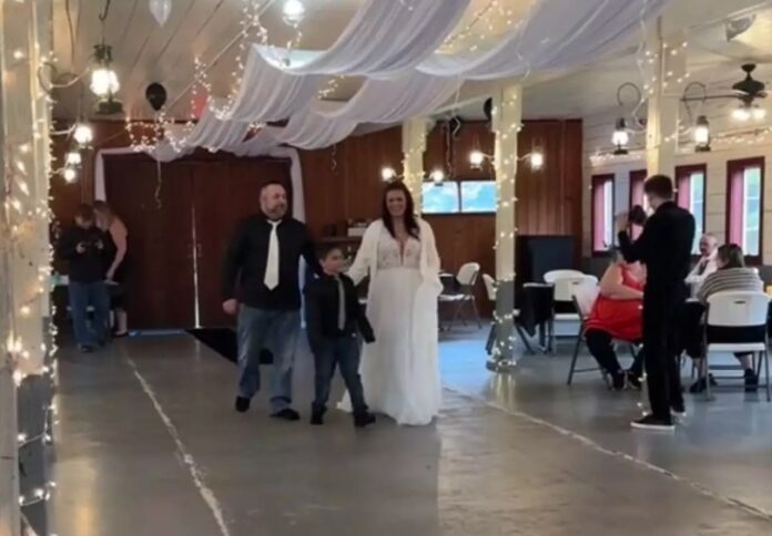 Στο βίντεο που ανέβασε, η νύφη και ο γαμπρός μπαίνουν πιασμένοι χέρι χέρι στη διακοσμημένη αίθουσα δεξιώσεων, και ο χώρος είναι σχεδόν άδειος από κόσμο.