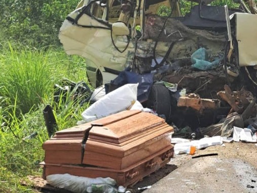 Δεκαπέντε άνθρωποι που συνόδευαν τη σορό συγγενή που μεταφερόταν για την κηδεία του (φωτογραφία, επάνω, από το Twitter) σκοτώθηκαν χθες Παρασκευή στο Καμερούν όταν συγκρούστηκε το μίνιμπας στο οποίο επέβαιναν με φορτηγό, ο οδηγός του οποίου επίσης έχασε τη ζωή του, ανακοίνωσε ο υπουργός Μεταφορών.