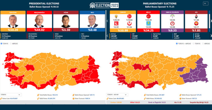 Ο Ρετζέπ Ταγίπ Ερντογάν προηγείται με ποσοστό 50,01% με καταμετρημένο το 87,63% των ψήφων. Με τα δεδομένα που διαμορφώνονται στην Τουρκία πέντε ώρες αφού έκλεισαν οι κάλπες, ο Ταγίπ Ερντογάν είναι ο μεγάλος νικητής της σημερινής εκλογικής αναμέτρησης για την ανάδειξη προέδρου της Τουρκίας. Το ποσοστό του Ταγίπ Ερντογάν αν και βαίνει μειούμενο παραμένει οριακά πάνω από 50%. Η εκλογική βραδιά στην Τουρκία προβλέπεται μακρά, μέχρι να αποσαφηνιστεί αν ο Ταγίπ Ερντογάν θα επανεκλεγεί από σήμερα ή θα περιμένει τον Β’ γύρο στις 28 Μαϊου για να αναδειχθεί πρόεδρος της Τουρκίας απέναντι στον αντίπαλό του Κεμάλ Κιλιτσντάρογλου που συγκεντρώνει το 44,22% των ψήφων αν και οι δημοσκοπήσεις τον έφερναν «σίγουρο» στην πρώτη θέση έναντι του Ερντογάν. Ο Κιλιτσντάρογλου, υποψήφιος έξι κομμάτων της τουρκικής αντιπολίτευσης λαμβάνει ποσοστό 44,22%, έξι μονάδες πίσω από τον επί 20 χρόνια ηγέτη της 7ης μεγαλύτερης οικονομίας του πλανήτη. Το γεγονός ότι η δυναμική δείχνει ότι το ποσοστό του Ταγίπ Ερντογάν φθίνει και μειώνεται σταδιακά με αργό ρυθμό κάτω από το 50%, μετατρέπει σε πραγματικό μυστήριο αν ο πρόεδρος της Τουρκίας θα καταφέρει να επανεκλεγεί από την πρώτη Κυριακή, παρά το γεγονός ότι τα γκάλοπ έδειχναν καθαρό προβάδισμα του υποψηφίου της ενωμένης αντιπολίτευσης Κιλιτσντάρογλου.