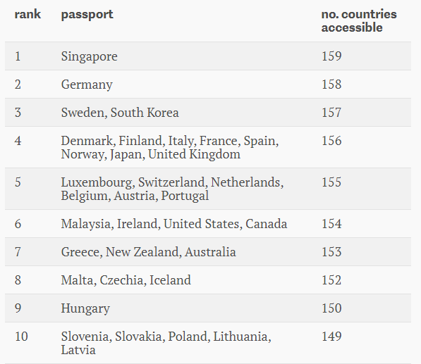 Για πρώτη φορά φέτος, μια ασιατική χώρα, η Σιγκαπούρη, εκθρόνισε τη Γερμανία από την κορυφή, μετά την απόφαση της Παραγουάης να άρει την απαίτηση βίζας για του Σιγκαπουριανούς, δίνοντας έτσι εύκολη πρόσβαση σε 159 χώρες, έναντι 158 χωρών για τους Γερμανούς.
