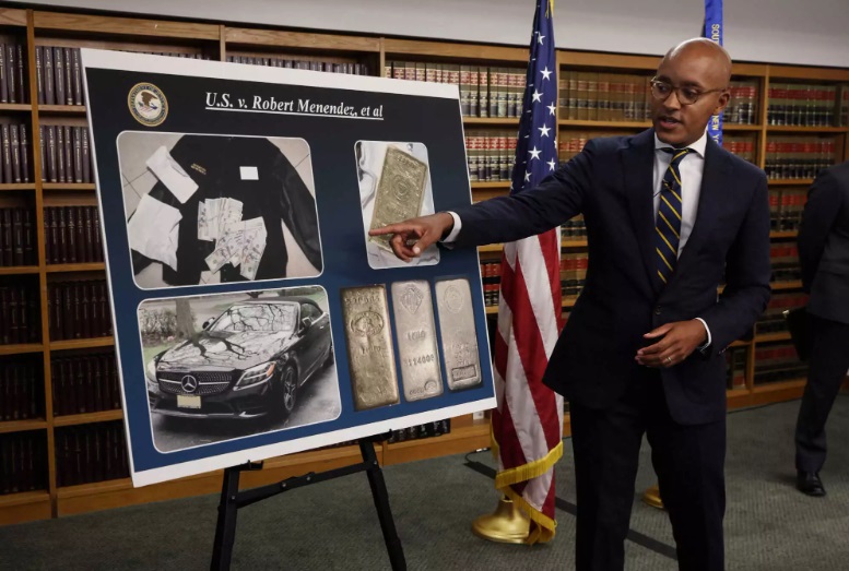 Η εισαγγελία των ΗΠΑ έδωσε χθες στη δημοσιότητα φωτογραφίες από τις ράβδους χρυσού και τα χρήματα, τα οποία κατηγορούνται ότι έλαβαν ο 69χρονος Μπομπ Μενέντεζ και η σύζυγός του, Ναντίν, από 3 Αιγύπτιους επιχειρηματίες ώστε να τους εξυπηρετήσουν σε σκοπούς που είχαν σκοπό να πλουτίσουν από αυτούς.