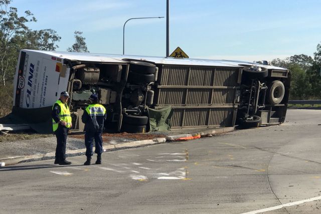 Το λεωφορείο μετέφερε 35 ανθρώπους όταν βγήκε από τον δρόμο και ανατράπηκε σε κυκλικό κόμβο. Ακινητοποιήθηκε στην αριστερή του πλευρά πάνω στο οδόστρωμα κατά μήκος των προστατευτικού κιγκλιδώματος.