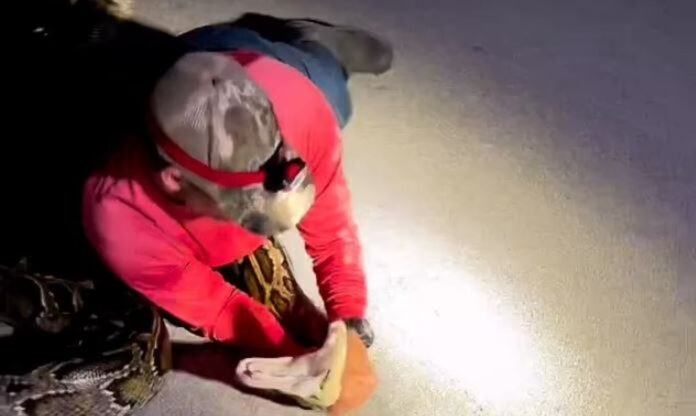 Στο βίντεο που ανήρτησαν στα social media οι κυνηγοί φιδιών Στίβεν Γκάουτα και Τζέικ Βάλερι έχει καταγραφεί καρέ-καρέ η μάχη που έδωσαν με τον πύθωνα βάρους 56 κιλών ο οποίος είναι τόσο μακρύς όσο μια μια ενήλικη καμηλοπάρδαλη σε ύψος.