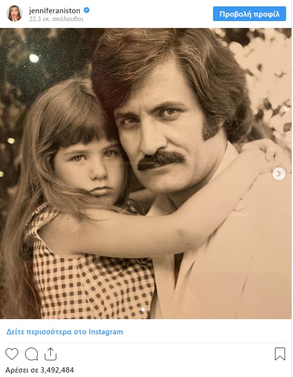 Με αφορμή τα Χριστούγεννα, η Τζένιφερ Άνιστον ανέβασε στο λογαριασμό της στο Instagram μια φωτογραφία με τον Έλληνα πατέρα της, Τζον Άνιστον (Γιάννη Αναστασάκη), όταν η ίδια ήταν ακόμα κοριτσάκι. «Χριστούγεννα με έναν από τους δημιουργούς μου. Τότε και τώρα. Σ΄ αγαπάω μπαμπά», έγραψε η διάσημη ηθοποιός στην ανάρτησή της.