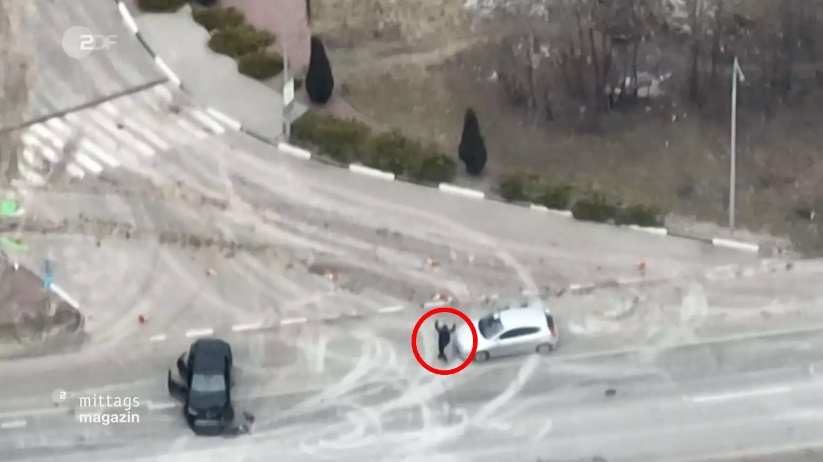 Ήταν 14:16 της 7ης Μαρτίου όταν ένας άνδρας, πρώην ηλεκτρολόγος που κατατάχθηκε ως εθελοντής για να πολεμήσει τους Ρώσους, ο Ζανόζα, είχε την αποστολή να καταγράψει τι γινόταν στον αυτοκινητόδρομο Ε40 του Κιέβου, μόλις μερικά χιλιόμετρα δυτικά της ουκρανικής πρωτεύουσας. Το έκανε. Και όταν κατέγραψε την εκτέλεση, έστειλε τα πλάνα στο ZDF.