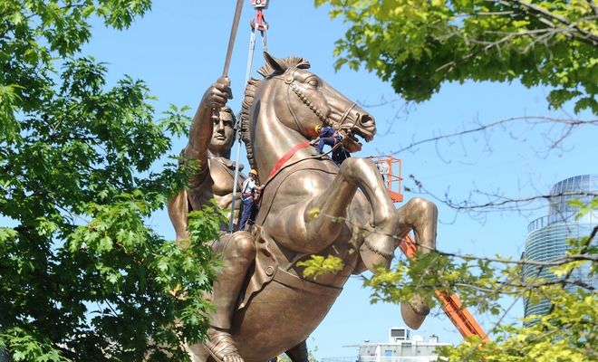 Απομακρύνθηκε αργά το βράδυ της Τετάρτης το άγαλμα του Μεγάλου Αλεξάνδρου, έφιππου στον Βουκεφάλα, που βρισκόταν στην αίθουσα αφίξεων του αεροδρομίου των Σκοπίων.