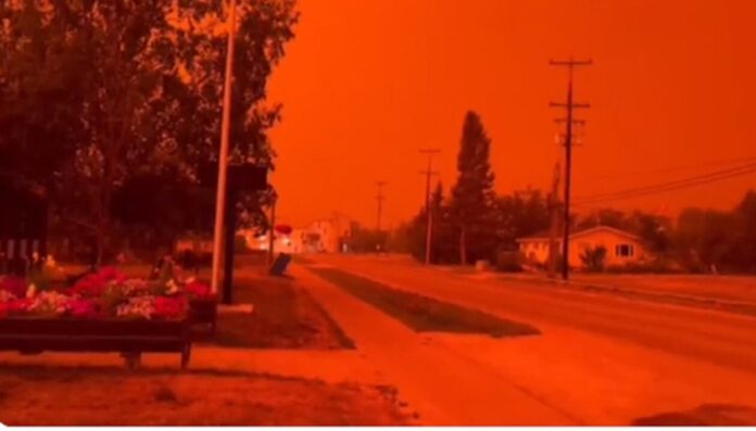 Ένα βίντεο που κυκλοφόρησε από την περιοχή δείχνει τις ακραίες συνθήκες που επικρατούν με τις πυρκαγιές όχι μόνο να έχουν κρύψει τον ήλιο αλλά να έχουν κάνει κατακόκκινο τον ουρανό.