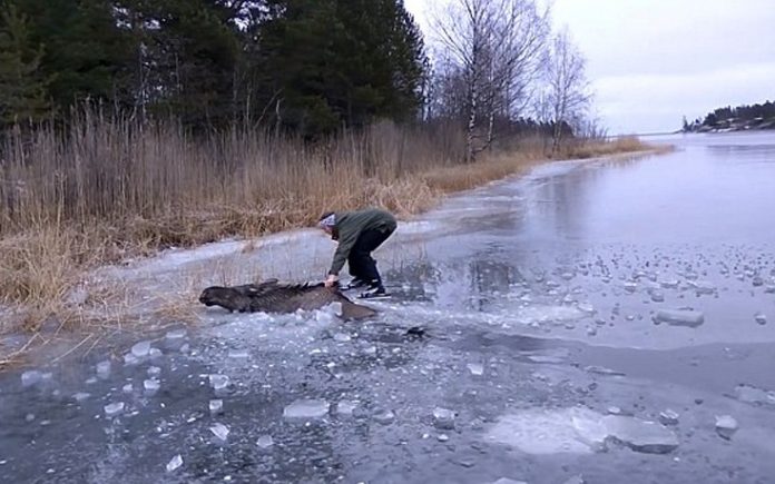 Η ανέμελη βόλτα μιας παρέας Σουηδών σε μια παγωμένη λίμνη μετατράπηκε σε περιπέτεια και αγώνας ζωής ή θανάτου όταν εντόπισαν μια άλκη, είδος μεγάλου ελαφιού- εγκλωβισμένη μέσα στον πάγο.