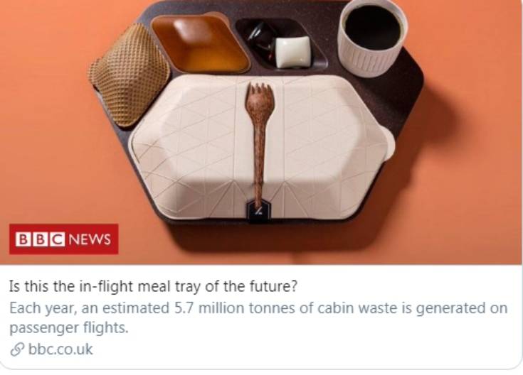 Στη συγκεκριμένα έκθεση παρουσιάστηκε ένας «πράσινος» δίσκος γεύματος, κατασκευασμένος από κόκκους καφέ, κώνο βάφλας για το επιδόρπιο, φύλλο μπανάνας για την τοποθέτηση της σαλάτας, ενώ τα μαχαιροπίρουνα είναι κατασκευασμένα από ξύλο καρύδας ένας φθηνό και εύκολα διαθέσιμο υλικό.«Είναι θέμα το βάρος των αποβλήτων, όταν πρόκειται για πτήσεις. Όσο μικρότερο το βάρος, σημαίνει λιγότερες εκπομπές», ανέφερε ο δημιουργός Τζο Ρόουαν.