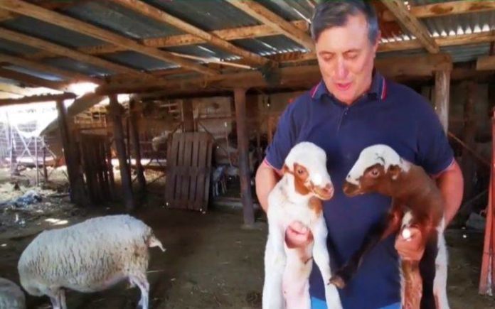 Αγρότης στα Λευκάκια του Δήμου Ναυπλιέων στην Αργολίδα κρατά στα χέρια του δύο μικρά αρνάκια που γεννήθηκαν χωρίς αυτιά.