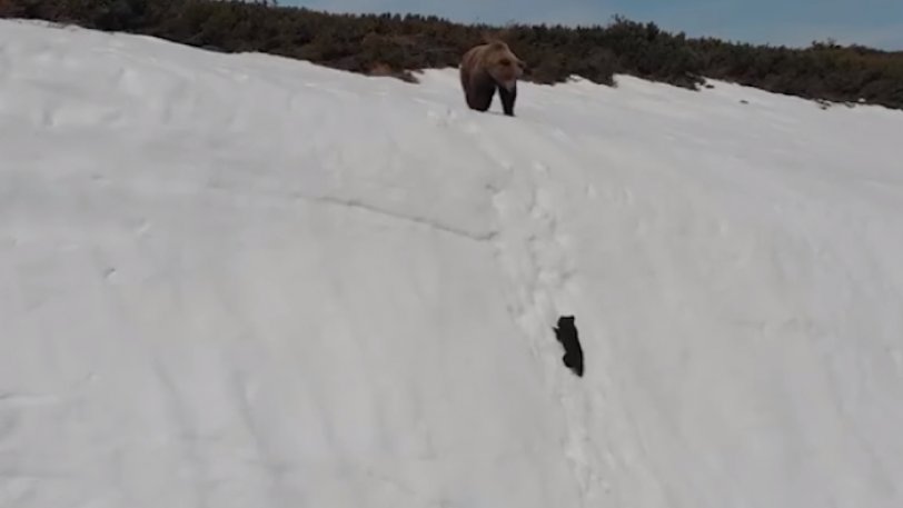 Η έμπειρη μητέρα δεν φάνηκε να δυσκολεύεται ιδιαίτερα στην αναρρίχηση, παρά την μεγάλη κλίση και το ύψος του χιονιού, το ίδιο όμως δεν ίσχυσε και για το μικρό της, που άρχισε να κατρακυλά για δεκάδες μέτρα.