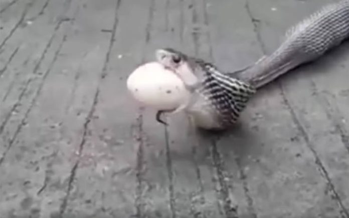Είναι η στιγμή που μία κόμπρα βγάζει ένα ένα τα αυγά που είχε καταπιεί. Το φίδι φαίνεται να βγάζει ένα ένα από το στόμα του εννιά μεγάλα αυγά κότας με την βοήθεια ενός γητευτή φιδιών.